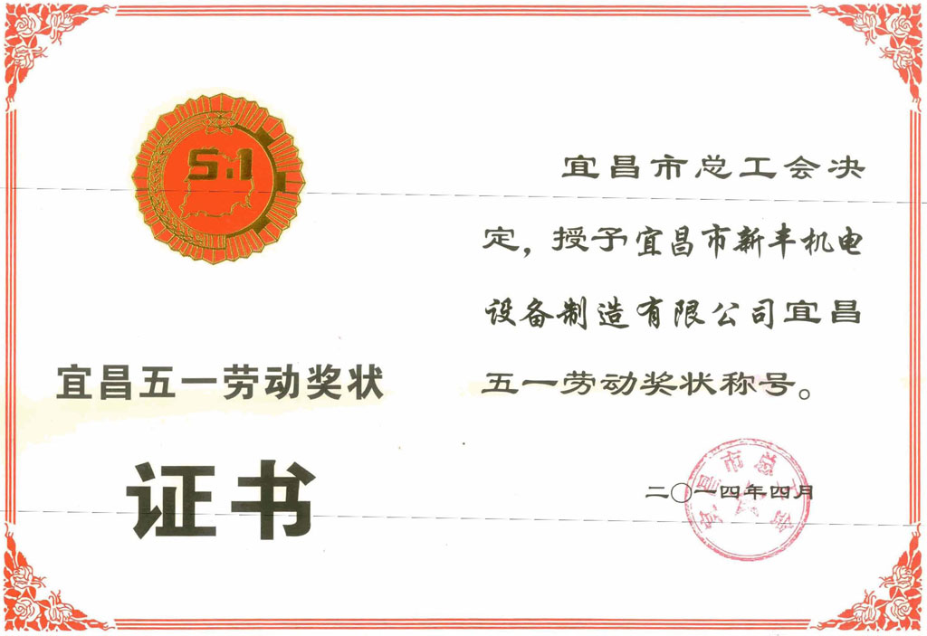 新豐機電獲宜昌五一勞動獎狀